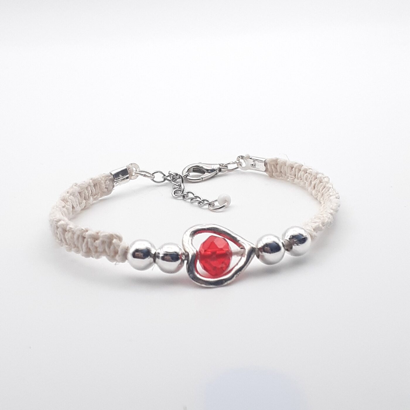 White Hemp Macrame Thin Cord Bracelet with a Red Faceted Crystal inside a Metal Heart Charm