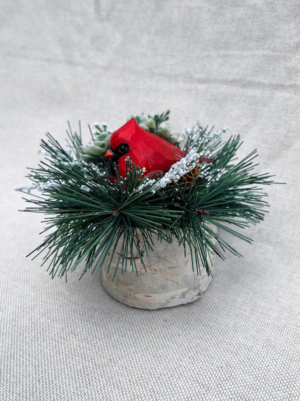 This little carved cardinal is safely nestled among the faux greenery atop a real birch log. Perfect arrangement to give a wintery touch to any small space.