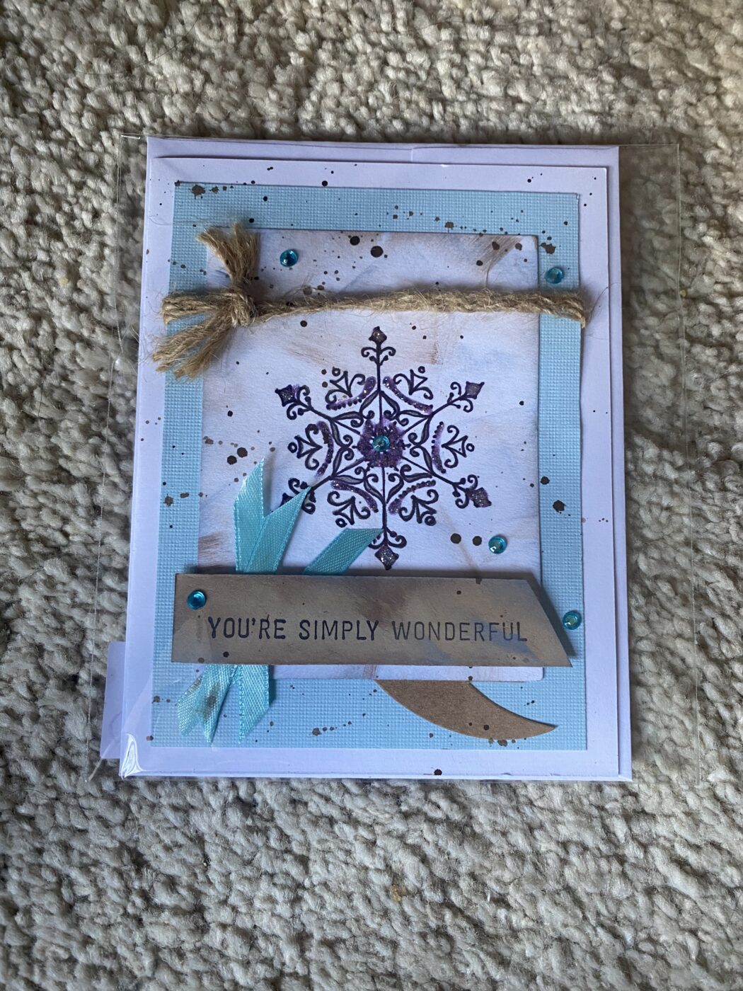A beautiful card for the holiday season to celebrate someone special. This hand-made card uses a combination of mixed media, gem stones, ribbon, and a stamped saying. Printed on quality card stock. Watercolour additions and layers adds to the beauty of this piece. A special way to show someone you care with a piece that was made with care and love. Blank inside so you can customize your own sentiment. Includes an envelope.