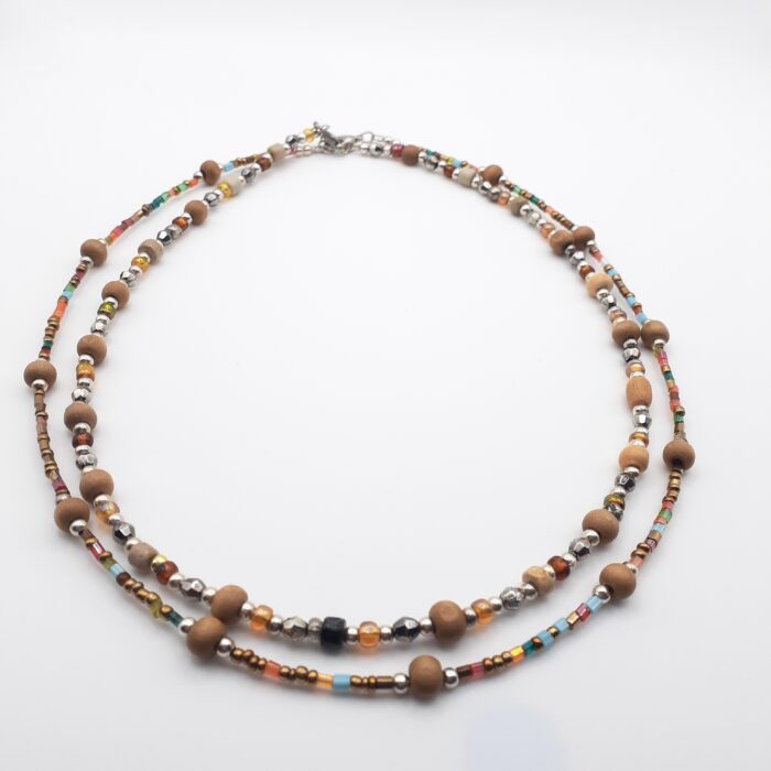 Set of 2 Thin Short Necklaces with Wood Beads and Colourful Glass Beads