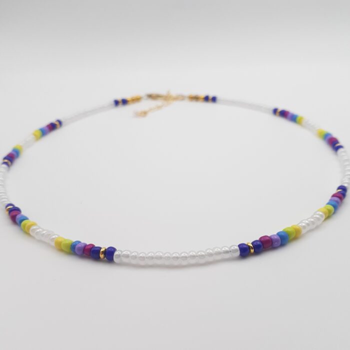 Short White Seed Bead Necklace with Splashes of Vibrant Colour Bands