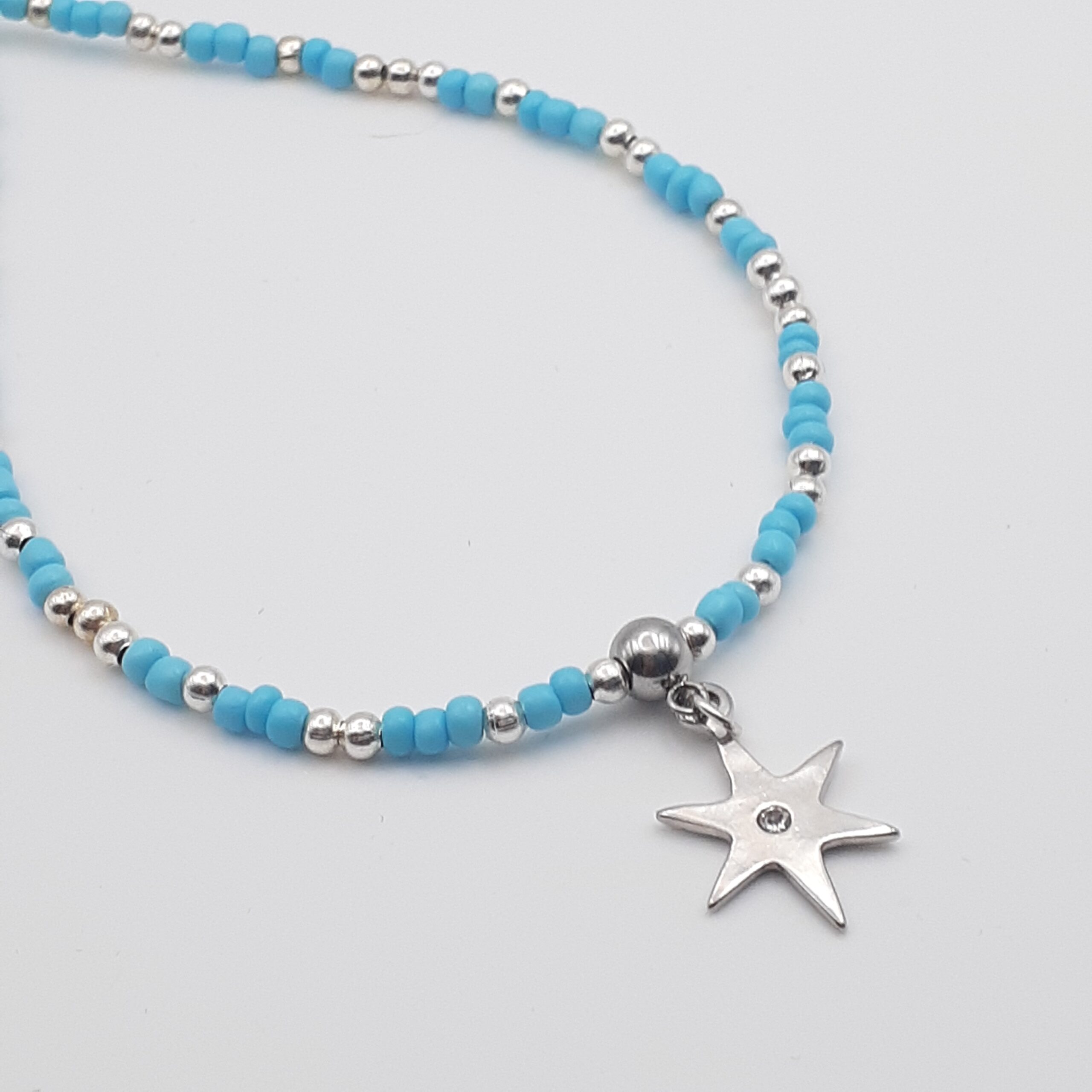Shining Star Burst Silver Charm Blue Seed Bead Medium Length Necklace