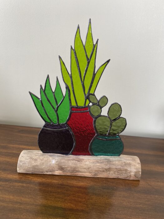 Stained Glass Panel of Three Cacti & Aloe in Clay Pots Inlaid on Driftwood Base – Purple/Red/Aqua