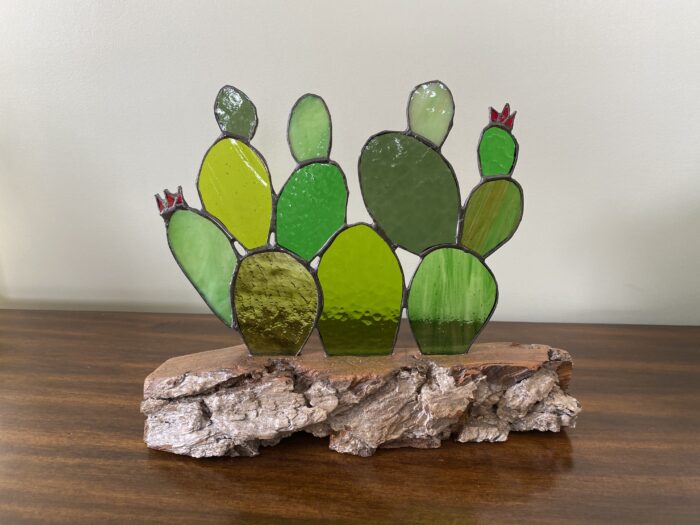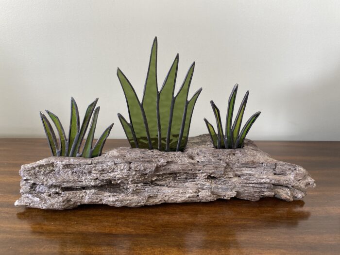 Stained Glass Cactus Succulents Centrepiece Inlaid on Driftwood Base       Â