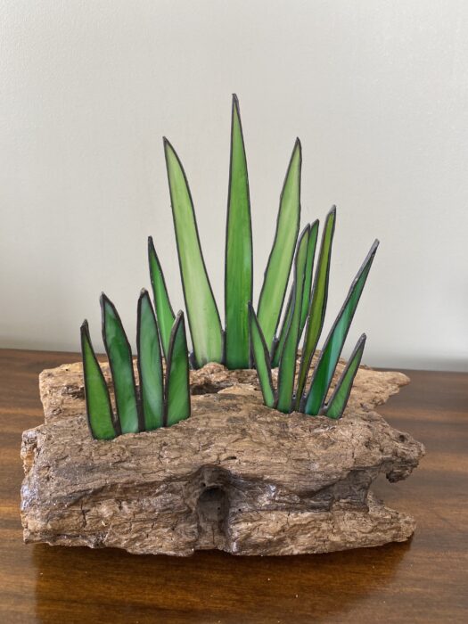 Stained Glass Cactus Agave Succulent Panel Inlaid on Driftwood Base  Â