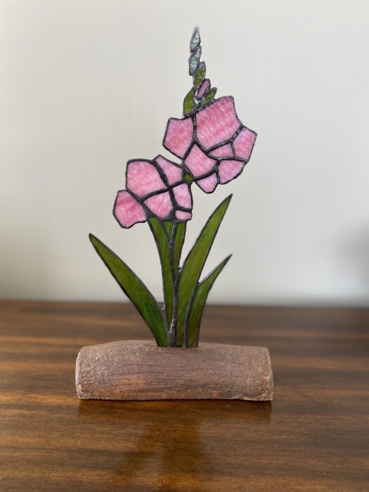 Stained Glass Gladiolus Inlaid on Driftwood Base – Light Pink Â