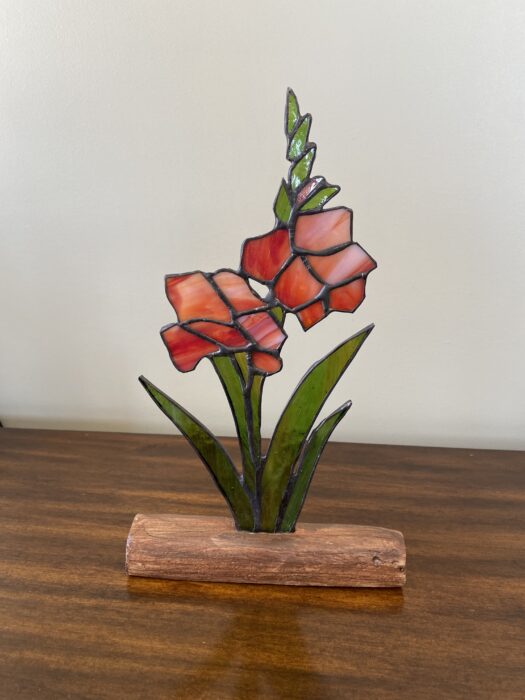 Stained Glass Gladiolus Inlaid on Driftwood Base –Â Red, Orange, White MixÂ