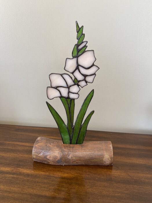 Stained Glass Gladiolus Inlaid on Driftwood Base – Off-White, Cream       Â