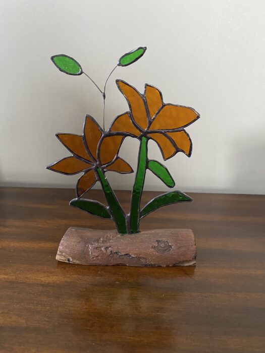 Stained Glass Lilies Inlaid on Driftwood Base – Orange   Â