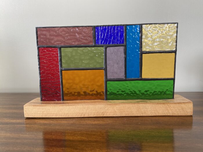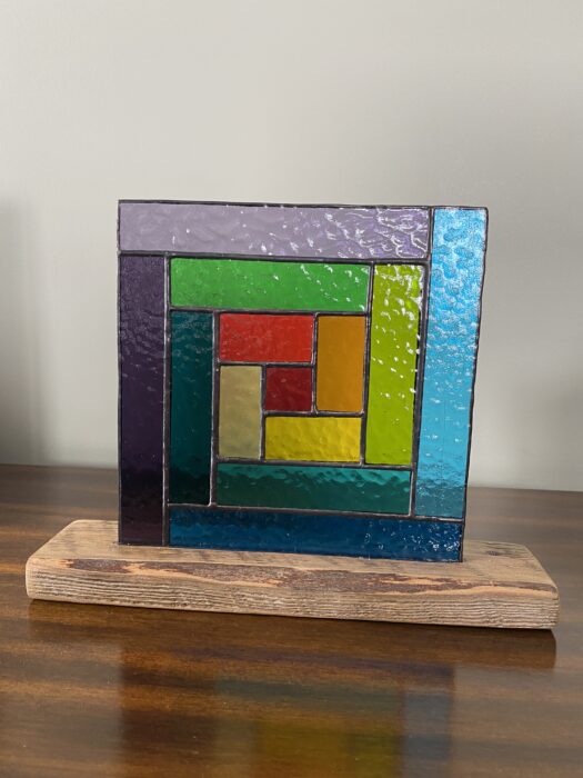 Stained Glass Geometric Panel Inlaid on a Hardwood Base – Rainbow Colours    Â