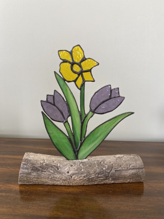 Stained Glass Tulip & Daffodil Spring Bouquets on Driftwood Base – Light Purple